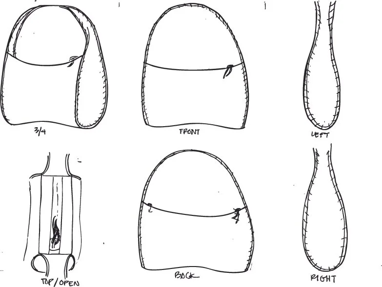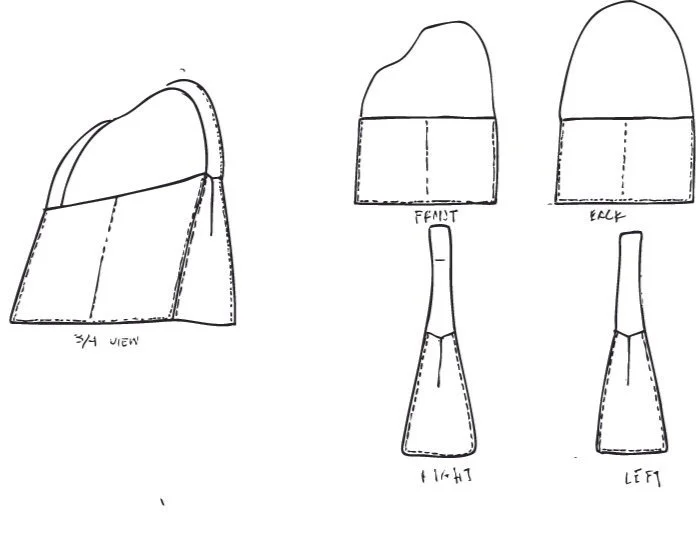 The bulk of this process was the physical drawings and iterations. Once I identified the gap I was designing for, I drew countless different handbag ideas, that called to me and fit my parameters. When I narrowed it down to the shape I kept coming back to, I kept iterating on that drawing to finalize the details.