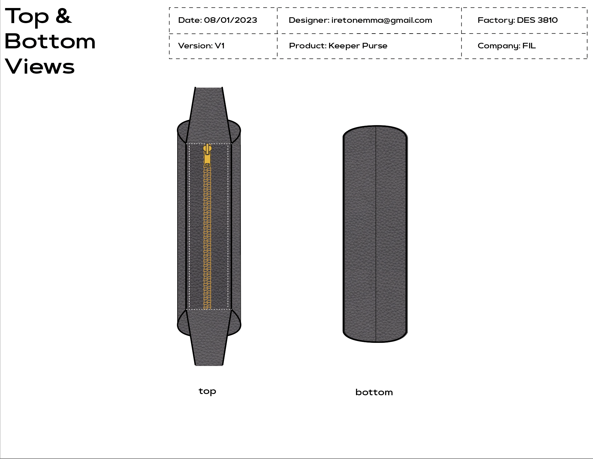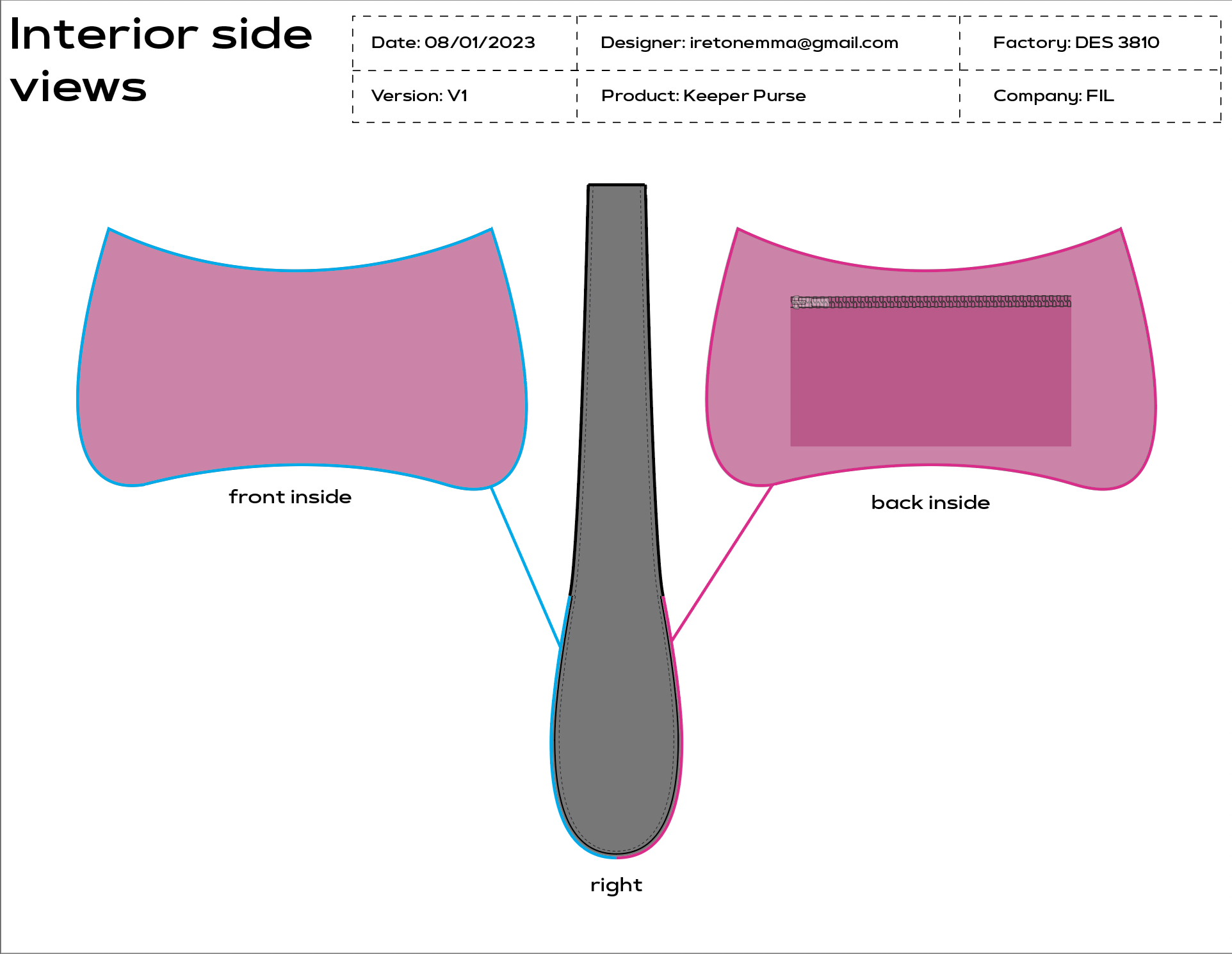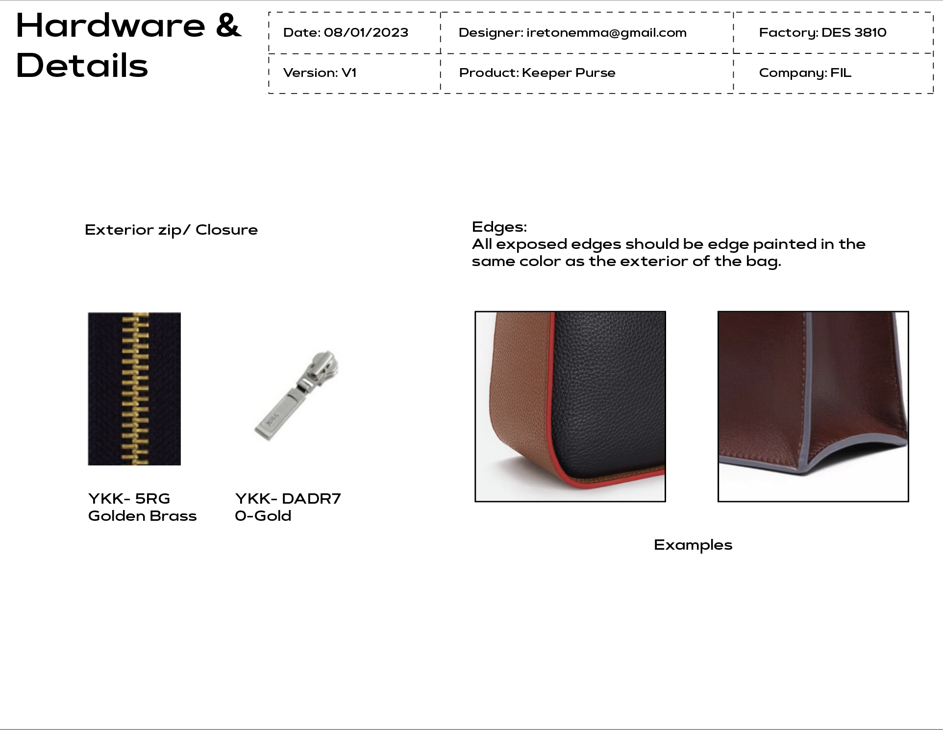 Working from the digital render and iterating based on prototypes, I created a tech pack explaining each aspect of the bag. Part of this was examining real factory samples of materials and accurately describing colorways and details.