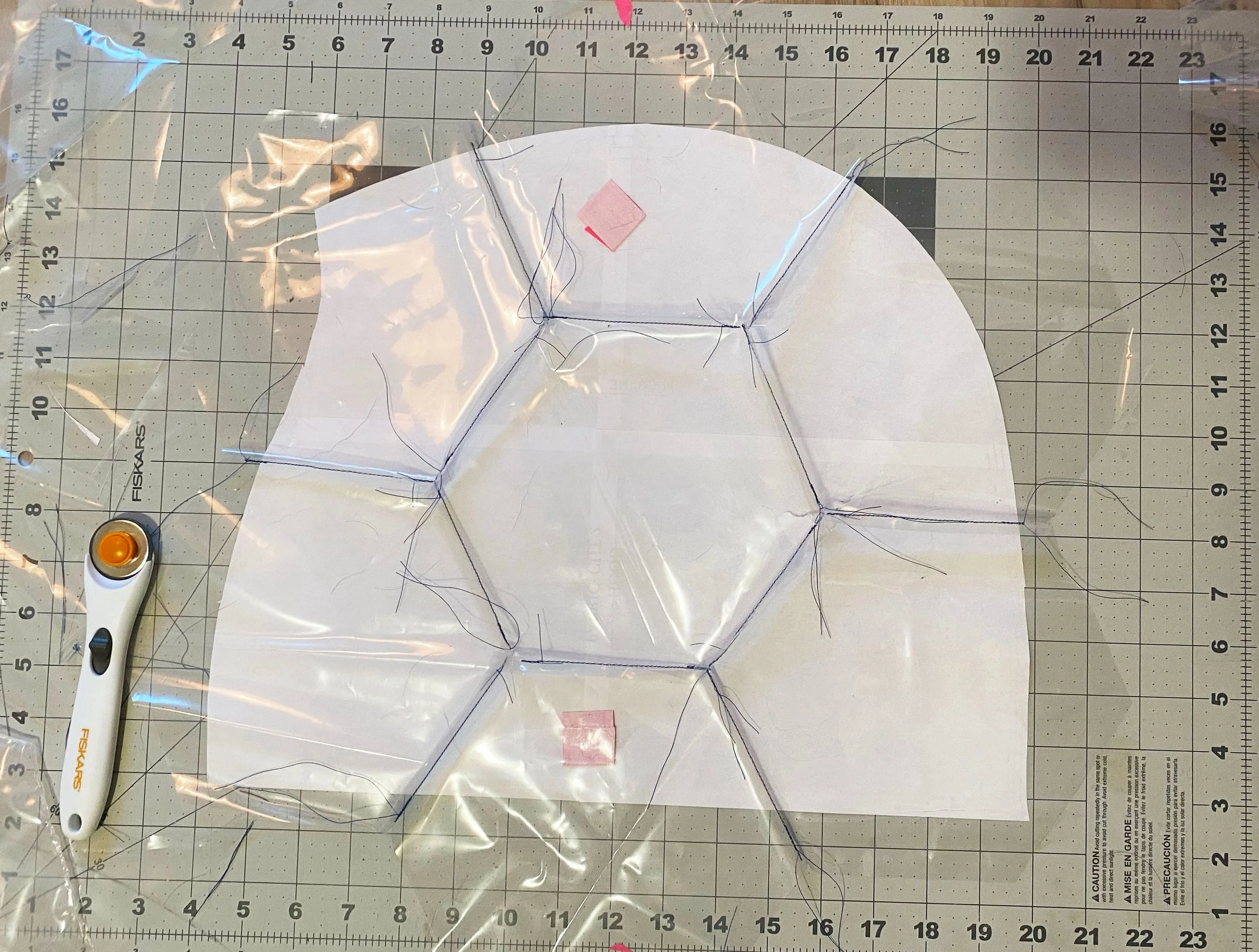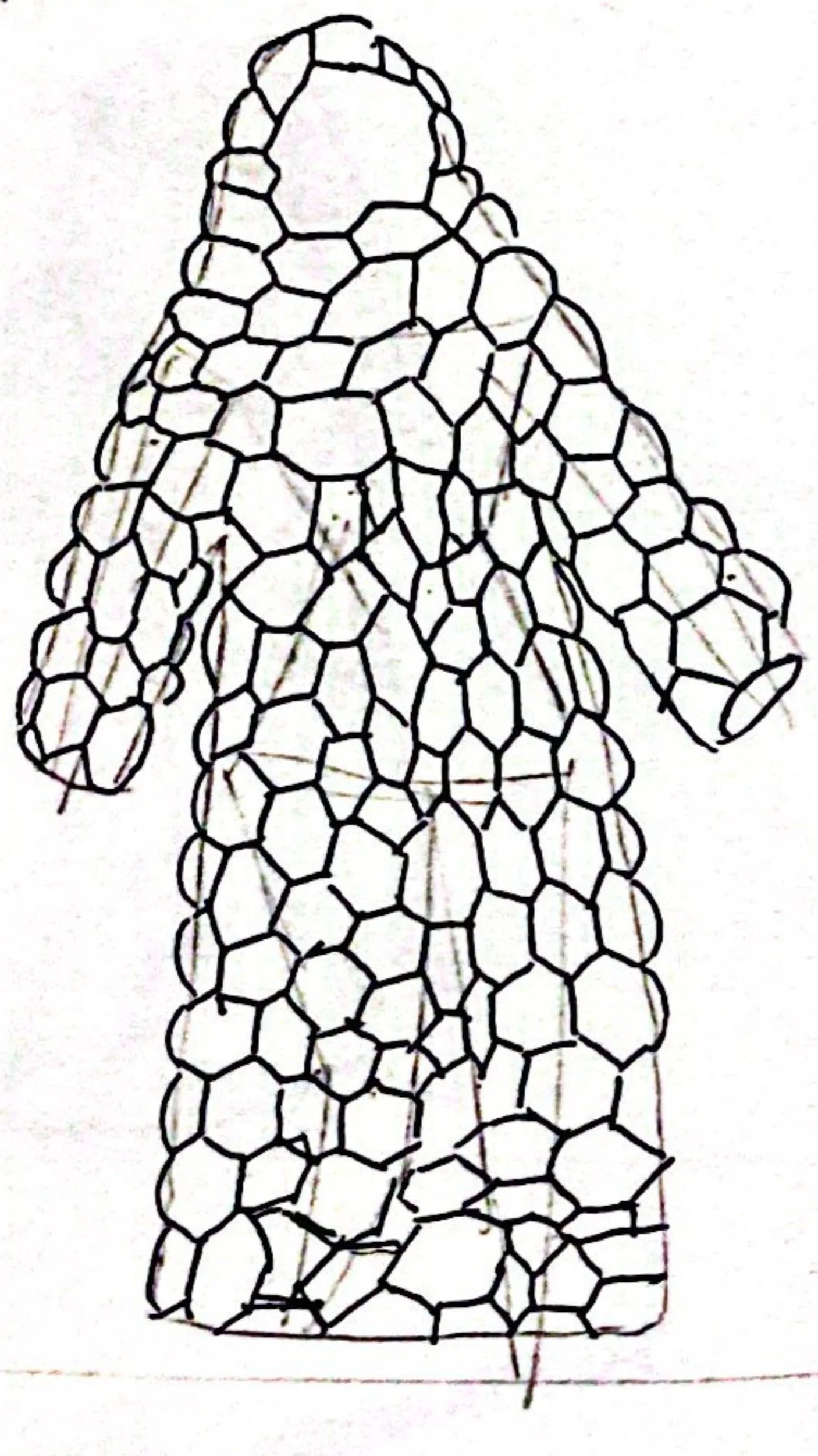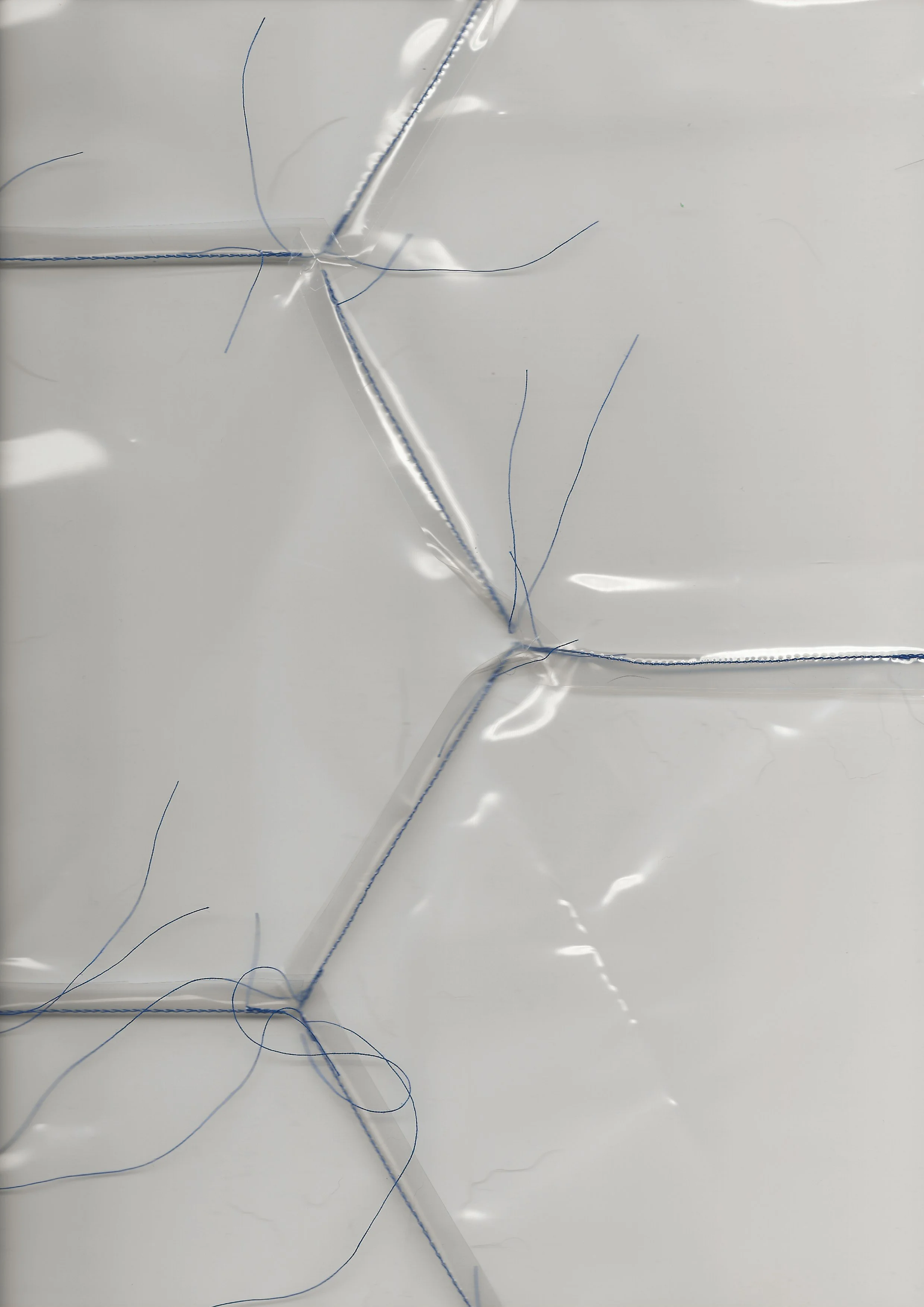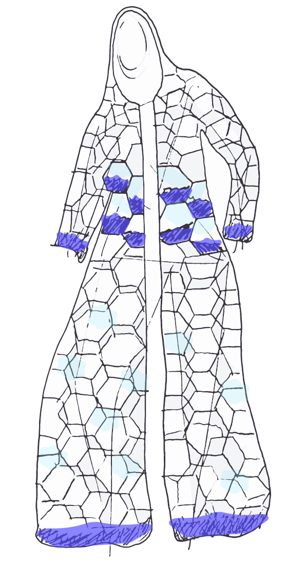 Garment 1, a raincoat constructed from hundreds of hexagons (the molecular shape of Silver Iodide) is not breathable, and fogs up from the body’s heat while wearing. In the lining are sealed hexagonal pockets with water inside.
