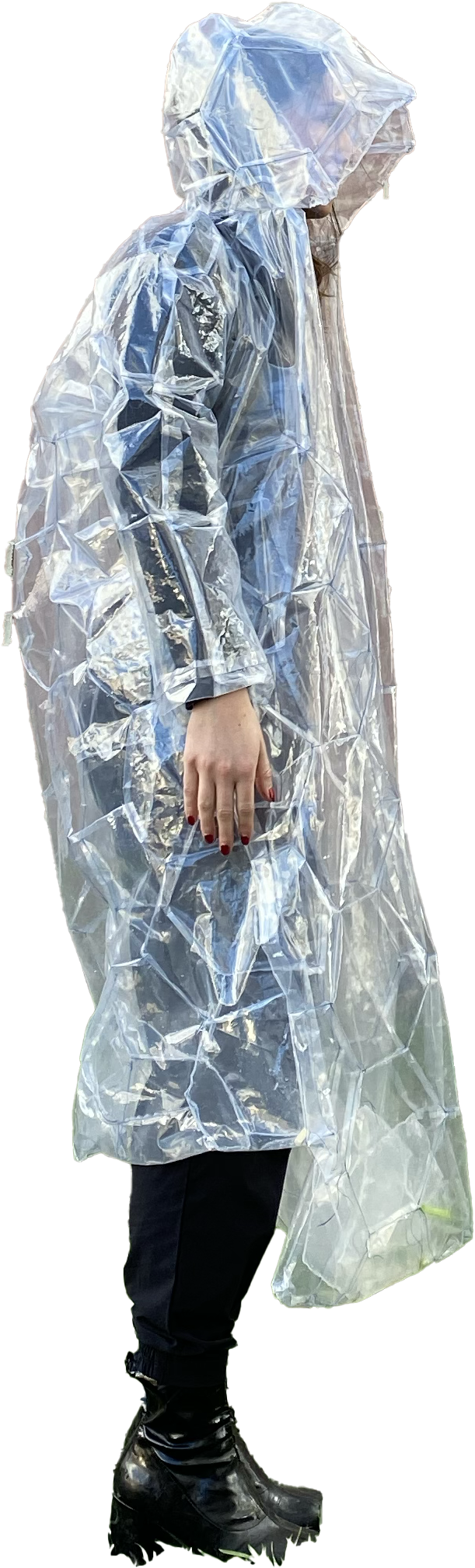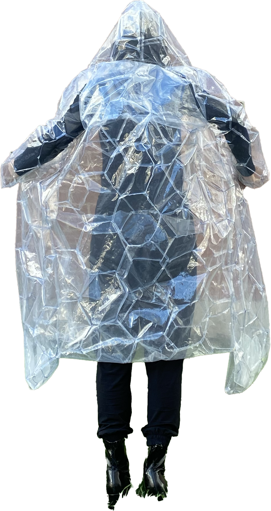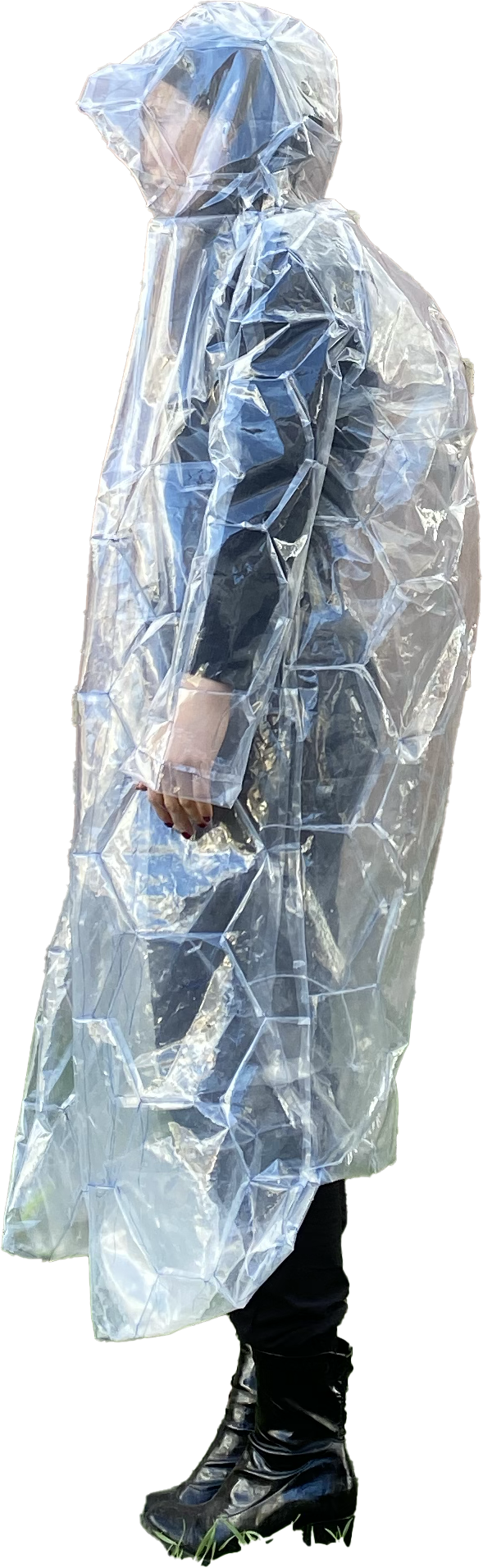 Double-layered quilted plastic creates an insulating, waterproof garment. In between the layers, water-filled hexagons rest at the hem of the coat. As it’s worn, the wearer’s body heat creates condensation, on the interior, that can be seen through the clear plastic to the outside.”