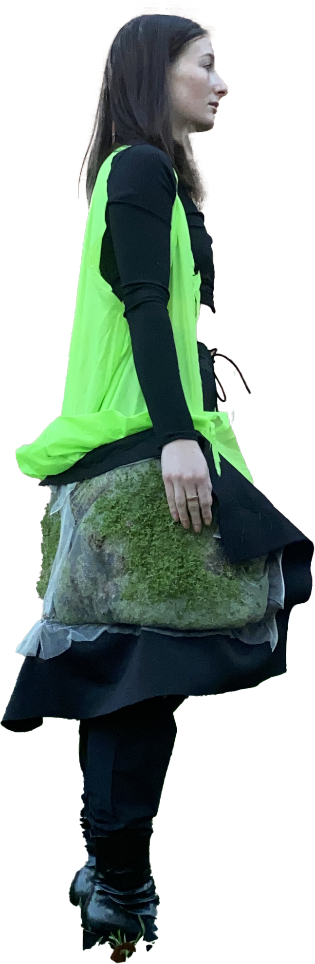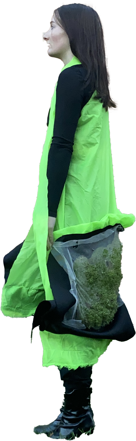 Garment 2 is a vest, constructed from recycled parachute with live chia seeds growing through mesh, mounted on neoprene. It pushes the wearer to consider how each movement and action impacts the natural world, and the literal weight that carries.