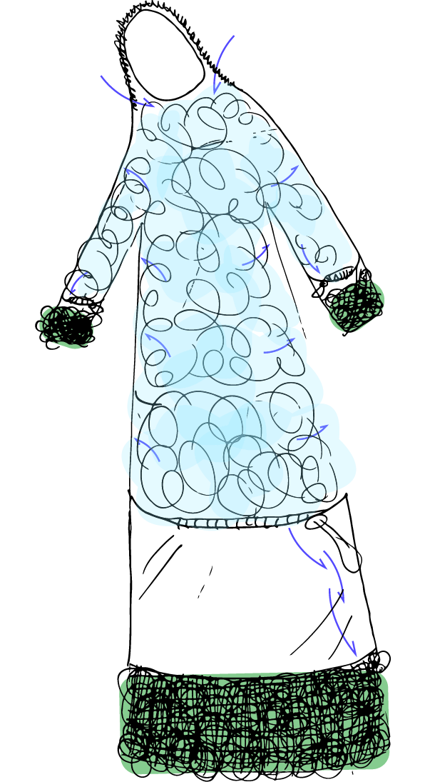 Starting with research about cloud seeding efforts in Utah and how humans modify the natural environment, then researching how clothing affects the body’s environment and temperature regulation, this project asked more questions than it answered. The research resulted in two garments, designed to be modifications of the human body’s environment while incorporating references to cloud seeding and the water cycle.