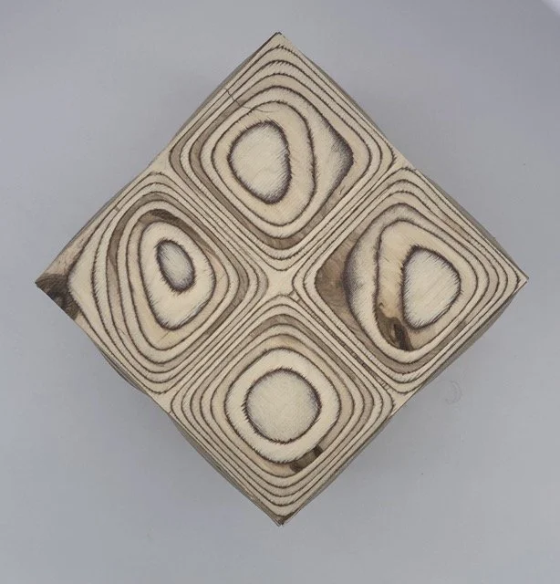 Initially, I was interested in creating an optical illusion out of the plywood, that would make it look soft in texture. But as I was making, I accounted for the layers of wood that made up the plywood, which made the pieces more interesting. Instead of relying on the combined shape to look soft, the variation in height and shape of each pocket created a stimulating visual experience. I chose to seal the wood with a clear sealant, instead of staining it, so the different colors in the wood would still appear with high contrast.