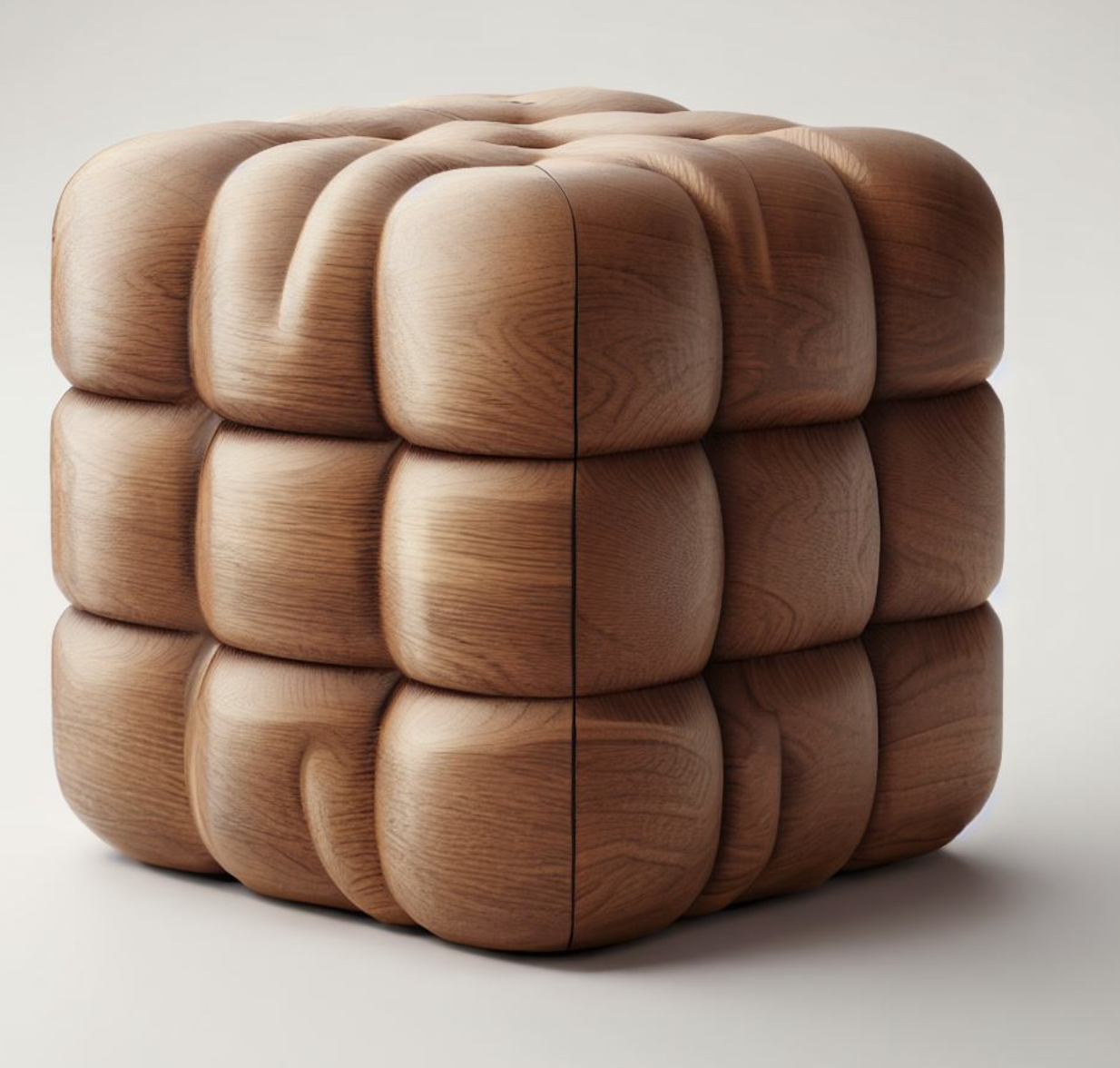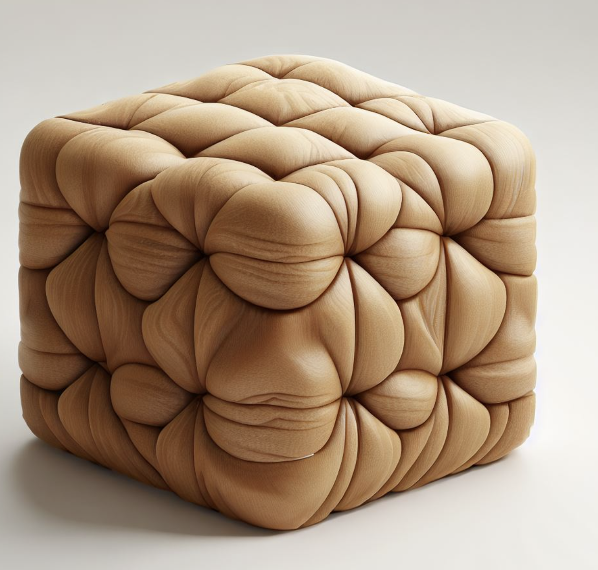 This was a multi-step process, beginning with artificial image generation and curation, then moving to 3D modeling, and then taking form in the physical world through CNC routing and finally wooden joinery to create a wooden cube.